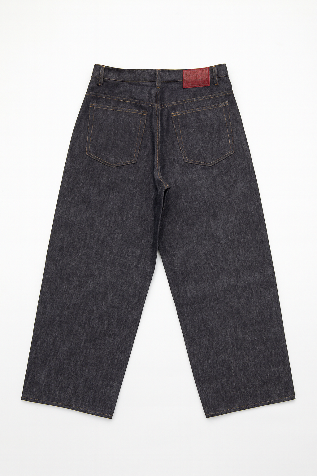 Designed with a wide-leg silhouette, these jeans stack naturally at the hem for a relaxed drape. Details include a 5-button fly, reinforced rivets, and classic 5-pocket construction. The clean back keeps the look sharp, while the waistband features a burgundy crocodile-embossed leather patch as a bold finishing touch.